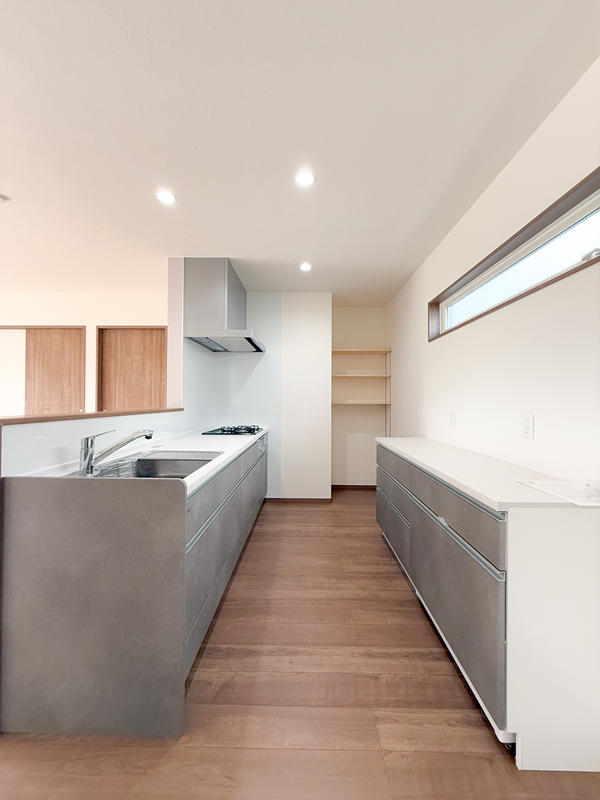 柔らかな色味のシステムキッチン、カップボード。高品質でお手入れしやすいタカラスタンダード社製。収納は充実していますが、奥にちょっとしたパントリーを。