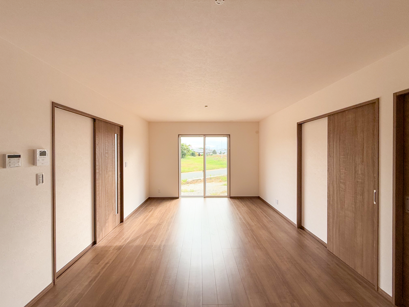 明るいLDK。凹凸がない空間は、実際よりも広く感じます。白と木目で統一されたLDKは、様々なインテリアでもなじみます。