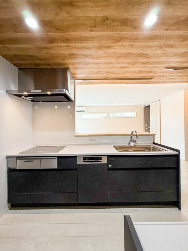 モノトーンでかっこいいキッチン。カップボードも揃えて。お手入れしやすいタカラスタンダード社製。